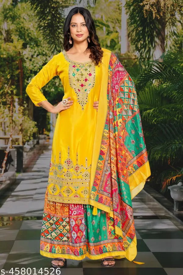 Yellow Chinon Fabrics Unstitched Suit With Stitched Sharara For Women
